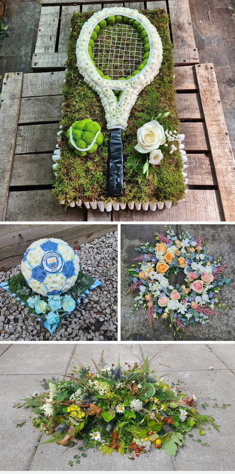 Funerals Coffin Arrangements, Crosses, Cushions and Pillows, Hearts, Special Tribute, Names and Letters, Oasis Sprays, Posies, Wreaths