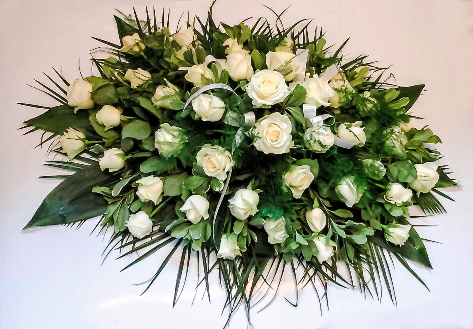 04 White Roses and Mixed Foliage Published 27th May 2020 at 1600 × 1112 in Coffin Arrangements 04 White Roses and Mixed Foliage White Roses and Mixed Foliage Coffin Arrangement Also Available in Red, Pink, Yellow and orange