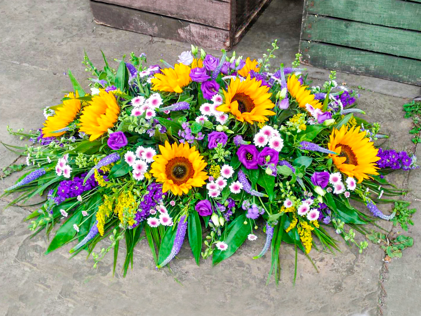 Stunning Coffin Arrangement using Sunflowers, with shades of Lilac and Purple