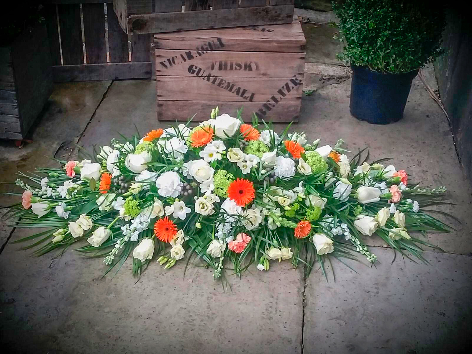 White Coffin Arrangement With Touches Of Orange And Green, , Florist, Radcliffe