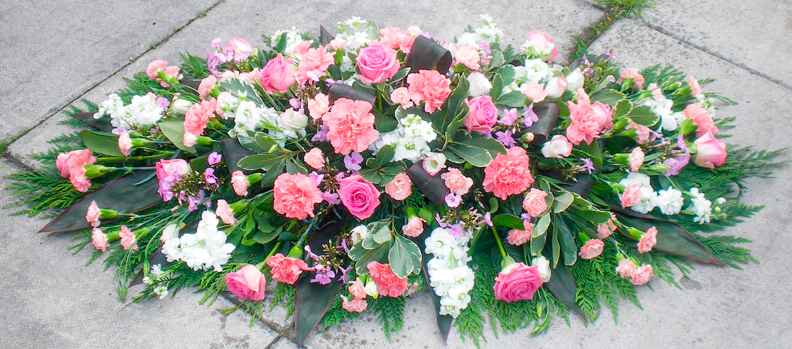 White Coffin Arrangement With Pink Roses And Pink Carnations Published 27th May 2020 at 1600 × 706 in Coffin Arrangements 15 White | Pink Roses, Carnations White Coffin Arrangement With Pink Roses And Pink Carnations, Florist, Radcliffe