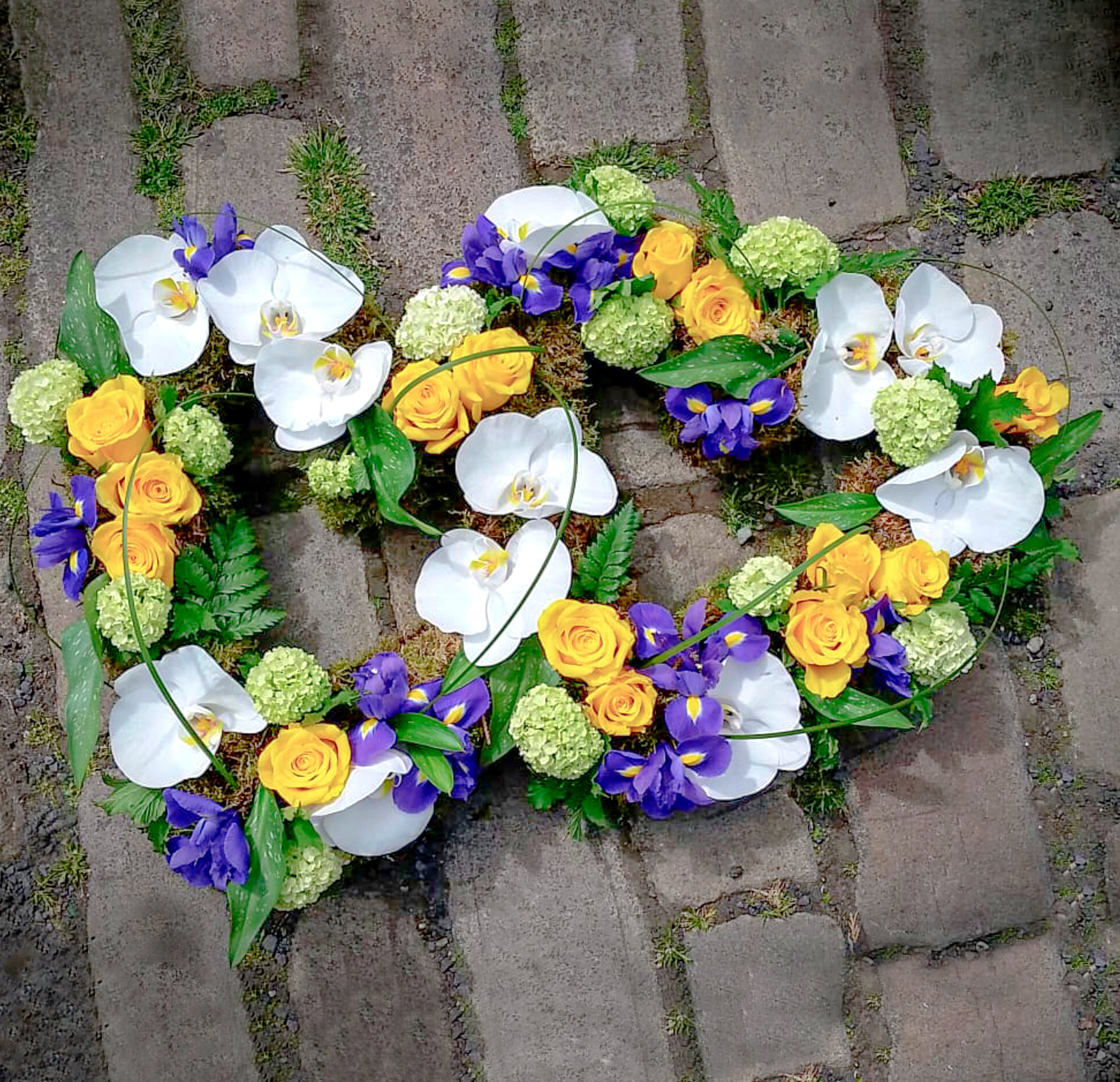 Double Heart : White, Yellow, Purple : Florist : Radcliffe Published 4th June 2020 at 2535 × 2448 in Hearts 04 Double Heart Double Heart in White, Yellow, Purple : Tribute Funeral Florist, Radcliffe